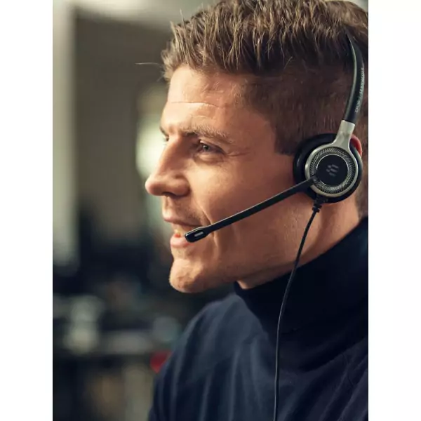El auricular Epos proporciona comodidad y resistencia para un uso intensivo. Sus almohadillas de imitación de cuero son cómodas de usar pero también tienen una función de reducción activa de ruido para no distraerse con los ruidos ambientales durante el uso.