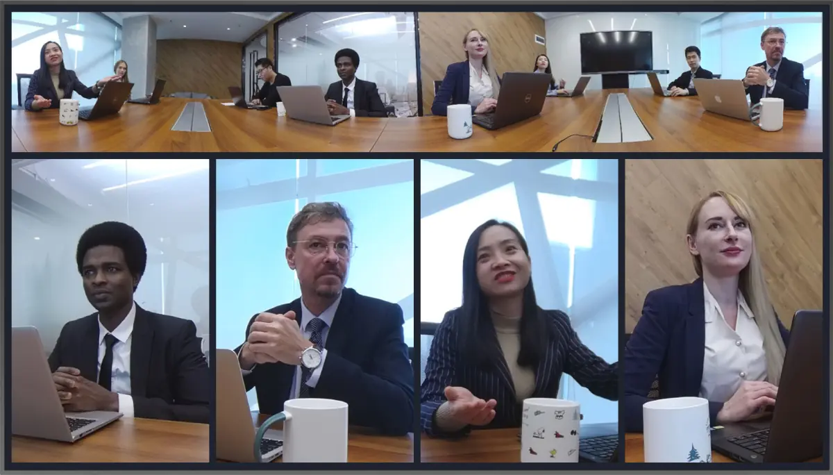 - Cámara: Gracias a sus 2 lentes FishEye, la cámara Kandao Meeting ofrece una visión de 360° de la reunión con resoluciónFull HD 1080p . Esta vista de 360° le permite capturar a todos los participantes presentes en la sala. Cámara inteligente, Kandao Meeting Pro 360 es capaz de detectar al hablante activo y enfocarlo para resaltarlo en la imagen. Puede mantener una vista de 360° y, al mismo tiempo, mostrar varios participantes en una miniatura individual. La última modalidad consiste en mostrar dos banners con vistas panorámicas de 180°;