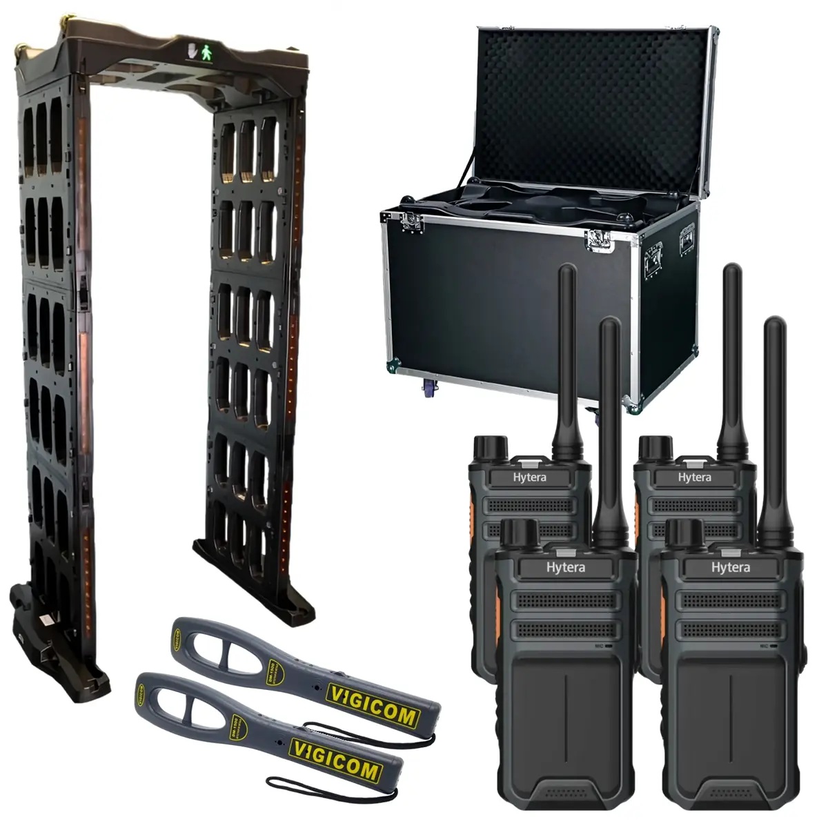 Este kit completo le permite garantizar la seguridad de todo tipo de eventos. como festivales, conciertos, eventos, etc. Este kit le permitirá detectar la presencia de metales con el portal y detectores y comunicarse con el walkie-talkie walkies talkies.