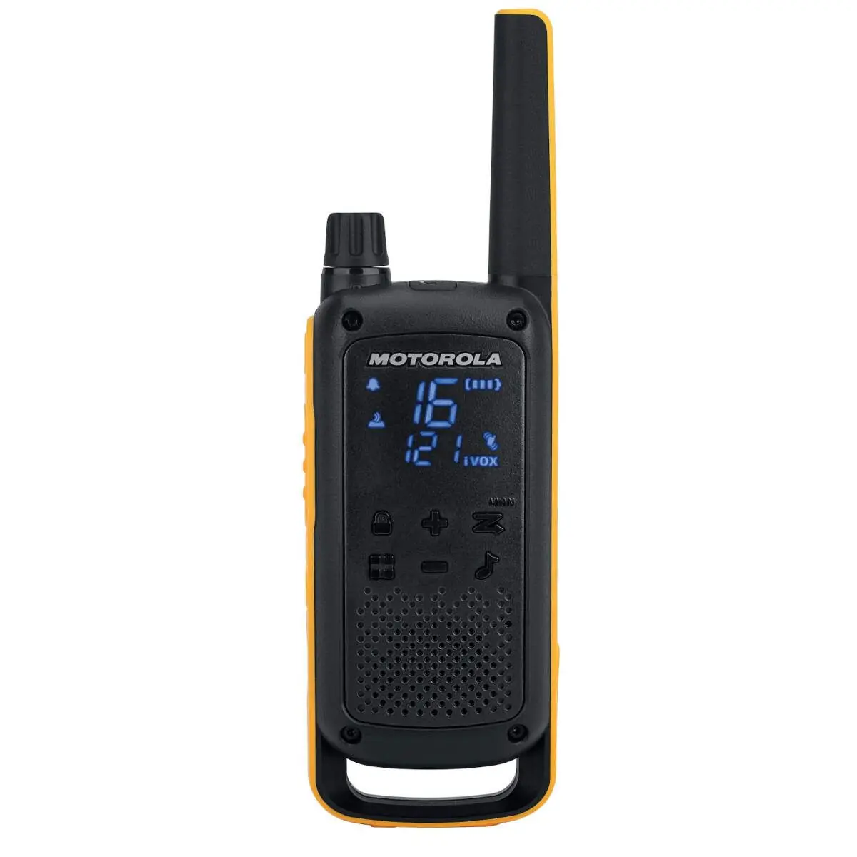 Kit de 4 walkies talkies-walkies Motorola T82 Extreme con estuche, cargador, correas y 4 auriculares con micrófono + 4 micrófonos parlantes remotos, robusto, resistente al agua IP54