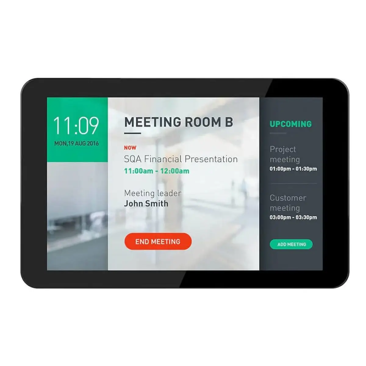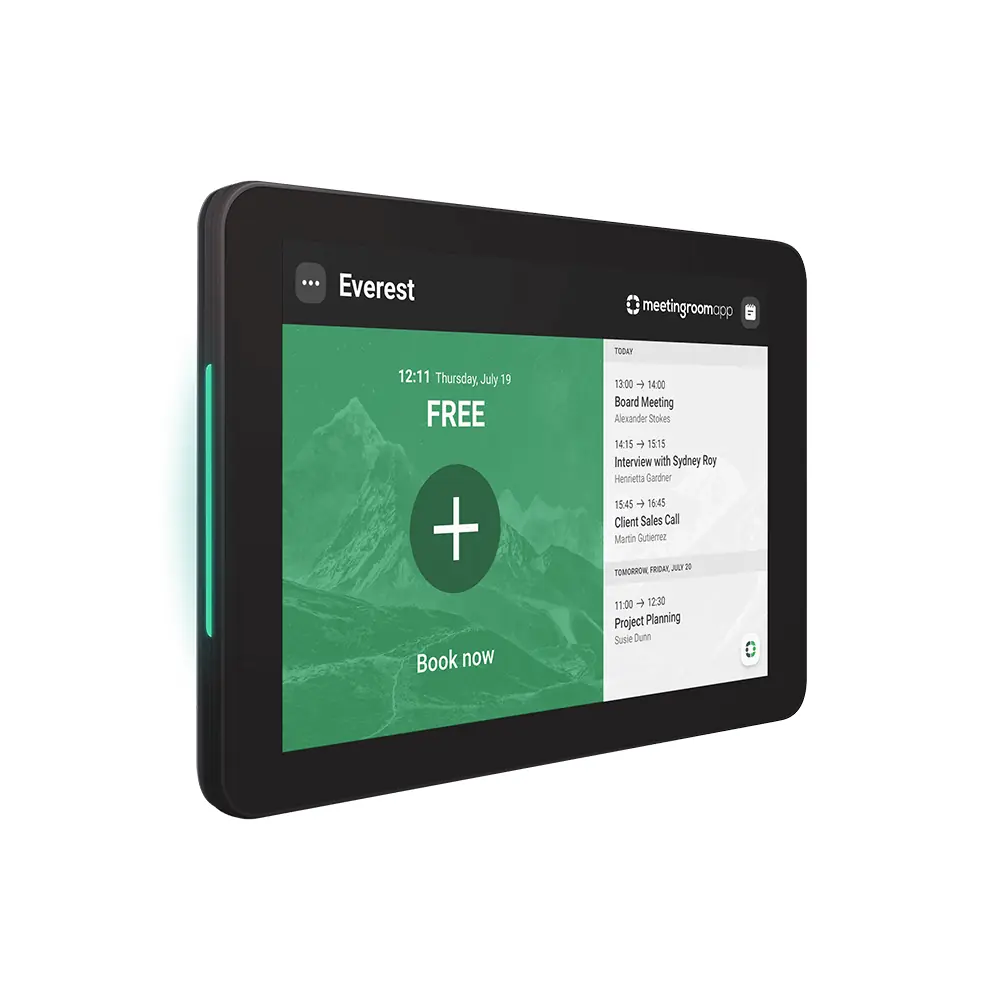 Pantalla de reserva de sala: gracias a su funcionamiento de larga duración (24h al día, 7 días a la semana), esta tableta Android es perfectamente adecuada para el mundo profesional. En una empresa, sincroniza esta tableta táctil con tu sistema de agenda (requiere una aplicación de reserva de sala). Las luces LED, situadas a cada lado de la pantalla, informan a los colaboradores sobre la disponibilidad de la sala.